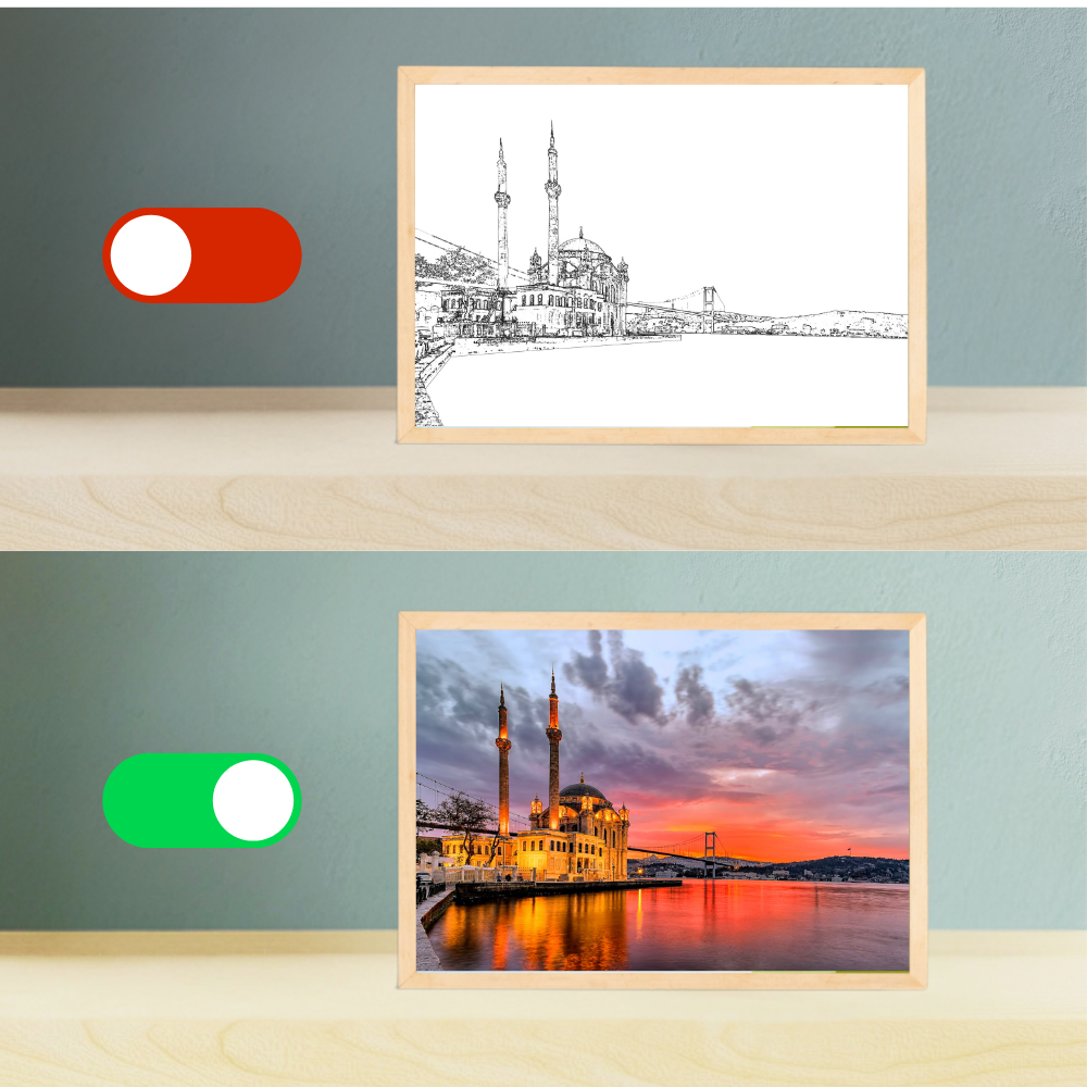 Tablonun ışığı kapalıyken dingin bir karakalem, ışık açıldığında rengârenk bir dünyaya dönüşüyor. Hepsi özel koleksiyonumuzdan, senin için üretildi.