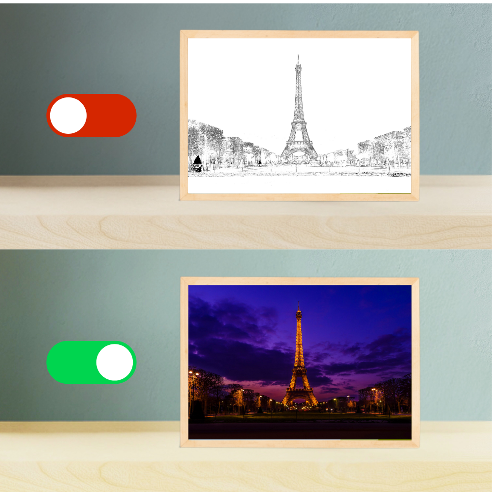 Tablonun ışığı kapalıyken dingin bir karakalem, ışık açıldığında rengârenk bir dünyaya dönüşüyor. Hepsi özel koleksiyonumuzdan, senin için üretildi.