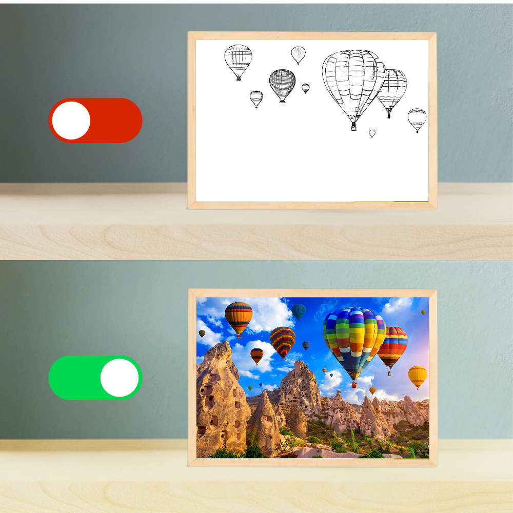 Tablonun ışığı kapalıyken dingin bir karakalem, ışık açıldığında rengârenk bir dünyaya dönüşüyor. Hepsi özel koleksiyonumuzdan, senin için üretildi.