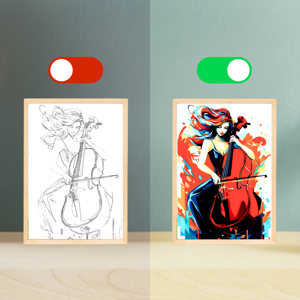 The Art Up’ın geliştirdiği çift katmanlı baskı tekniği, karanlıkta zarif bir karakalem görünümü, ışık açıldığında ise rengârenk bir tabloyu bir araya getirir. Estetik ve inovatif bir sanat deneyimi.
