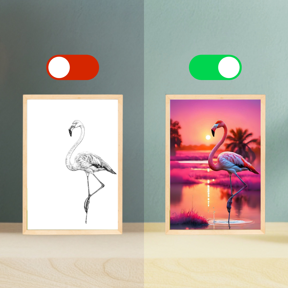 Tablonun ışığı kapalıyken dingin bir karakalem, ışık açıldığında rengârenk bir dünyaya dönüşüyor. Hepsi özel koleksiyonumuzdan, senin için üretildi.