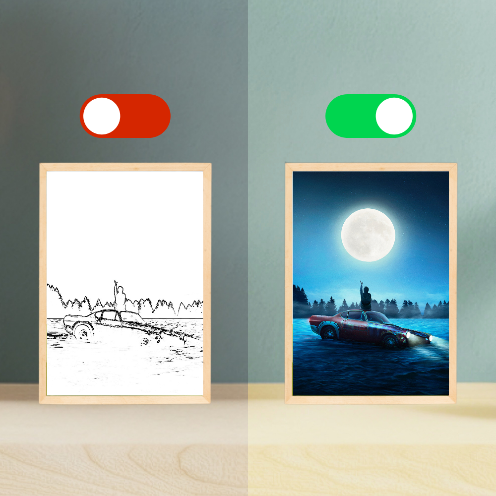Tablonun ışığı kapalıyken dingin bir karakalem, ışık açıldığında rengârenk bir dünyaya dönüşüyor. Hepsi özel koleksiyonumuzdan, senin için üretildi.