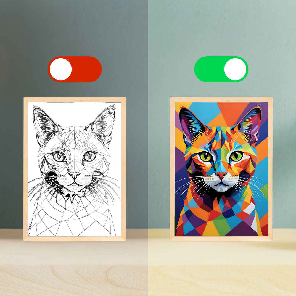 The Art Up’ın geliştirdiği çift katmanlı baskı tekniği, karanlıkta zarif bir karakalem görünümü, ışık açıldığında ise rengârenk bir tabloyu bir araya getirir. Estetik ve inovatif bir sanat deneyimi.