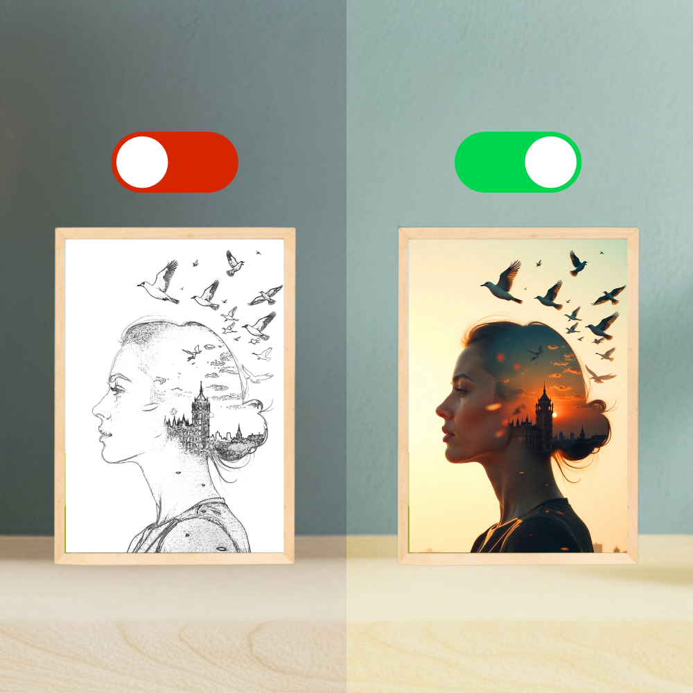The Art Up’ın geliştirdiği çift katmanlı baskı tekniği, karanlıkta zarif bir karakalem görünümü, ışık açıldığında ise rengârenk bir tabloyu bir araya getirir. Estetik ve inovatif bir sanat deneyimi.