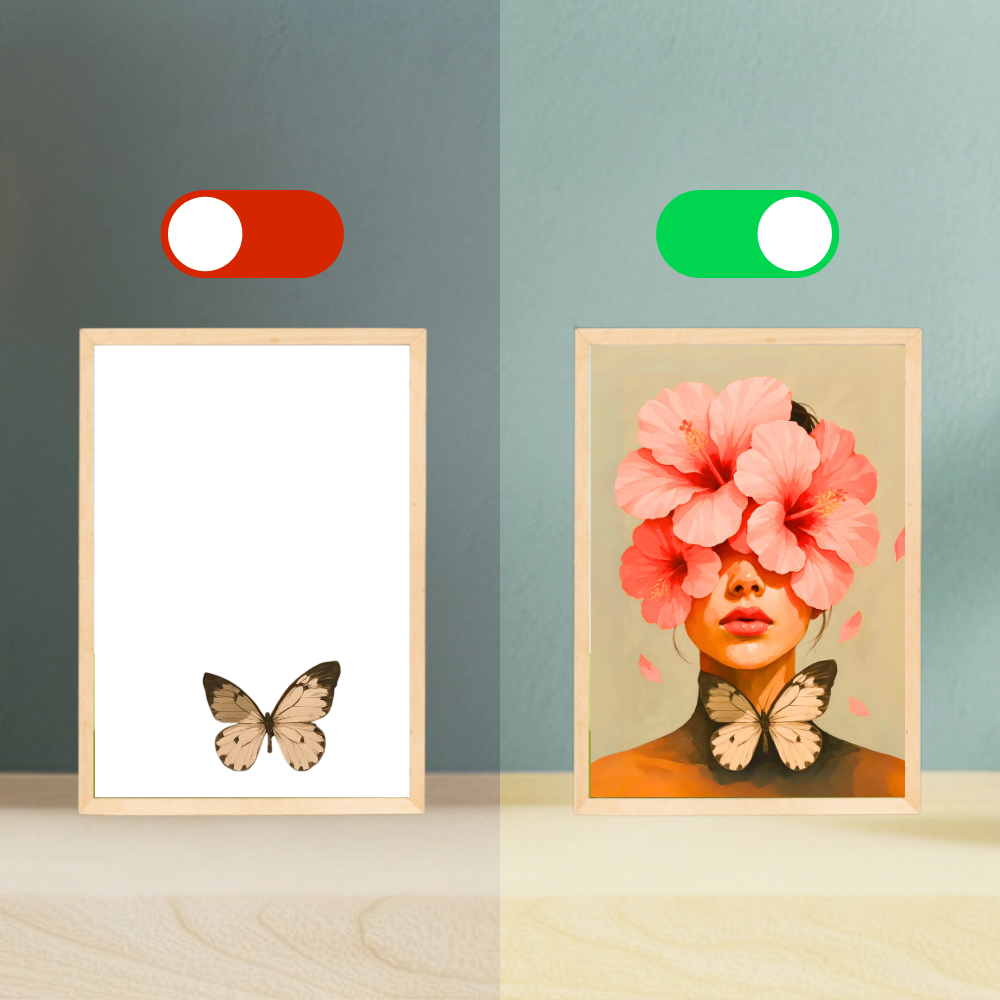 Tablonun ışığı kapalıyken sadece bir parçası görünen çizim, ışık açıldığında tamamlanıyor. Her detay, her renk ışıkla canlanıyor… Senin için özel olarak üretilmiş koleksiyon tasarımlarımızla sanat, her açılışta yeniden hayat buluyor.