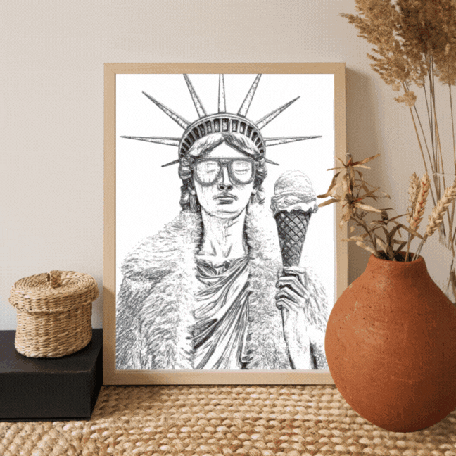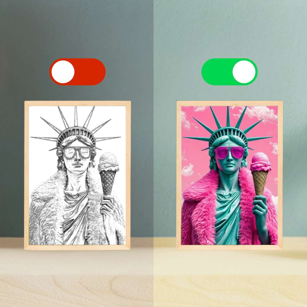 The Art Up’ın geliştirdiği çift katmanlı baskı tekniği, karanlıkta zarif bir karakalem görünümü, ışık açıldığında ise rengârenk bir tabloyu bir araya getirir. Estetik ve inovatif bir sanat deneyimi.